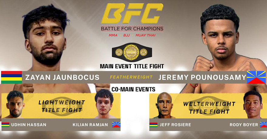 L’évènement phare de la soirée sera la confrontation entre le Mauricien Zayan Jaunbocus et le Réunionnais Jeremy Pounousamy. Deux autres duels tout aussi importants sont également au menu, mettant aux prises le Mauricien Udhin Hassan au Réunionnais Kilian Ramjan et le quadricolore Jeff Rosière au tricolore Rody Boyer.