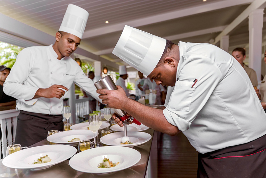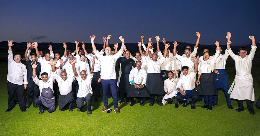 Quand nous arrivons à l’Heritage Le Telfair de Bel-Ombre ce matin-là, le paysage semble tout droit sorti d’une carte postale : un mélange apaisant de bleu et de vert, la rivière des Citronniers qui glisse doucement sous le pont, et cette pirogue immobile qui donne des airs de gondole égarée sous les tropiques. Ce mardi 7 octobre, le rendez-vous est donné au Cavendish Bar pour la deuxième journée de la Semaine de la Gastronomie Durable 2025, un événement annuel orchestré par Heritage Resorts & Golf, où les saveurs rencontrent la durabilité. Pour cette quatrième édition, le thème est : l’eau, source de vie, d’inspiration et d’équilibre. L’initiative met en lumière une cuisine responsable, locale et respectueuse des écosystèmes. Durant une semaine, les chefs des quatre établissements du domaine, Heritage Le Telfair, Heritage Awali, Le Château de Bel-Ombre et le C Beach Club, s’affrontent dans une série de défis culinaires sous l’œil attentif d’un jury international. L’événement offre aussi à de jeunes en formation, issus du MITD, de l’École de Cuisine Aline Leal (ECAL) et de la Southern Handicapped Association, une occasion unique de vivre une immersion aux côtés des plus grands chefs. Sous les voûtes du Cavendish, les échanges s’animent : autour de la table ronde, le chef étoilé Michelin et lauréat d’une Étoile Verte Jean-François Bérard, parrain de cette édition, dialogue avec Richard Ekkebus, triple étoilé Michelin, et Noël Chelvan, figure emblématique de la gastronomie mauricienne. On y parle passion, transmission et respect du produit, ce geste juste qui sublime sans trahir. Puis vient la masterclass. Le chef Bérard entre en scène. Chaque geste est précis, chaque saveur pensée. Le poisson repose dans son eau salée, les algues fument lentement sur les braises : une ode au terroir marin, une leçon d’humilité face à la nature. L’après-midi, cap sur le C Beach Club, où le chef Vijendra Kundun, candidat du jour, propose sa vision d’une cuisine enracinée : bred mouroum, pwason sale, satini pom damour, melon d’eau, des produits simples, revisités avec élégance et émotion. Une journée de partages et d’arômes, entre chefs, étudiants et passionnés, dans ce Sud sauvage où la durabilité se déguste autant qu’elle s’apprend.