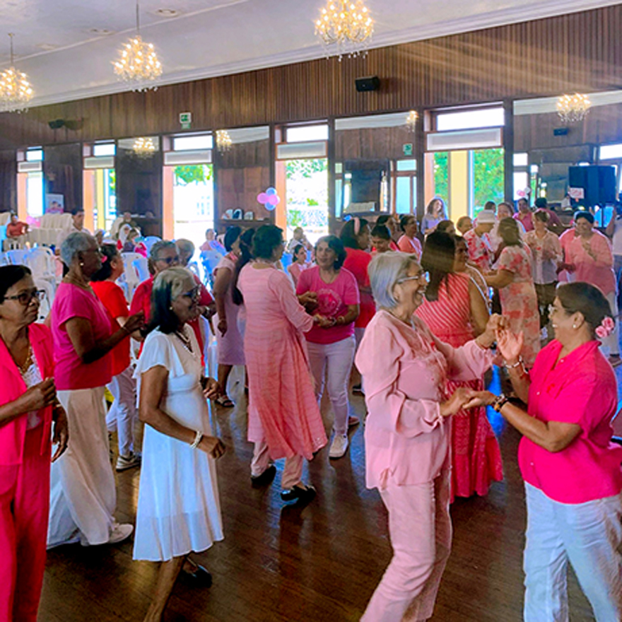 Coquettes jusqu’au bout de la french manucure rose éclatant, avec leur fleur (devinez la couleur !) dans les cheveux, leurs cabas assortis et des bonnets ou fichus ici et là ; elles envoient du lourd. Une merveilleuse dose de positivité, une ode à la vie et à la résilience. Ce jeudi 16 octobre, Link to Life, ONG qui apporte soutien et réconfort aux personnes atteintes de cancer, a convié ses membres à son «Pink October Breast Cancer Event». Dans la salle du Plaza, avec ses lambrequins, ses moulures et ses chandeliers, celles qui brillent, ce sont celles qui ont décidé de have the time of their life ! Avant la danse, tenez-vous bien, il y avait du chant, du tai-chi et du yoga…