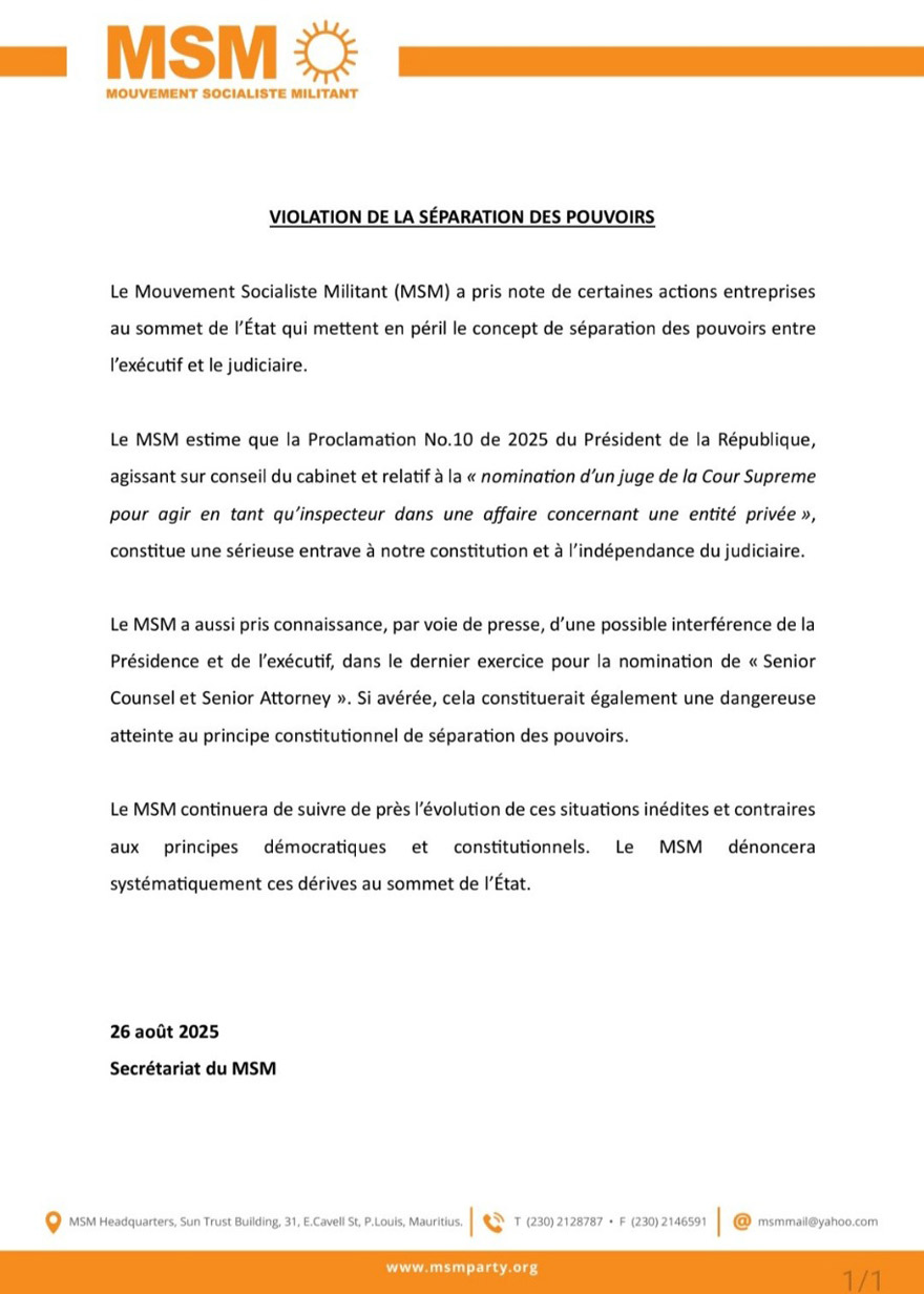 Certaines actions au sommet mettent en péril la séparation des pouvoirs entre l’exécutif et le judiciaire. C’est le MSM qui le dit dans un communiqué publié ce mardi 26 août. Le parti soleil dénonce la Proclamation No 10 de 2025 du président de la République, qui autorise la nomination d’un juge de la Cour Suprême pour agir en tant qu’inspecteur dans une affaire concernant une entité privée. Pour le MSM, cette décision constitue une entrave sérieuse à la Constitution et à l’indépendance de la justice.