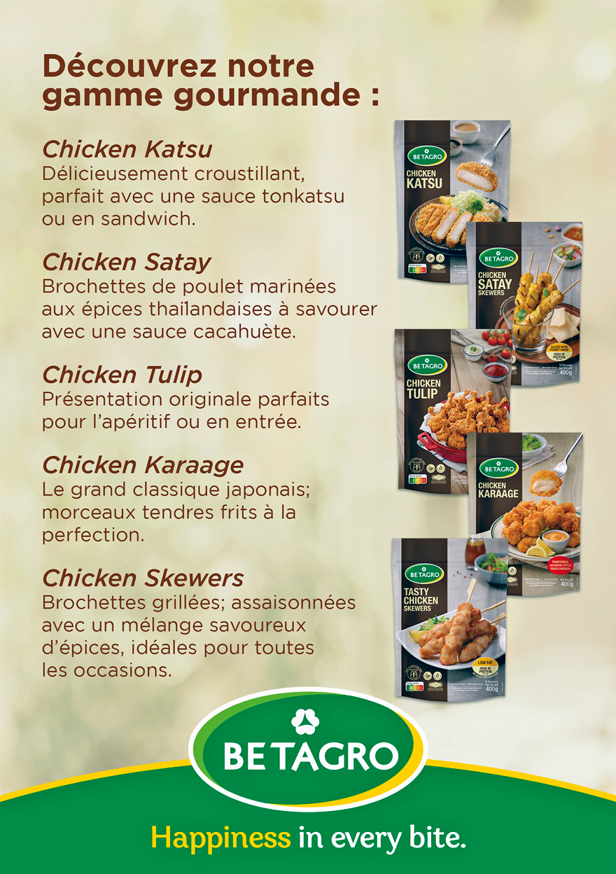 Fabriqués à partir de blancs de poulet 100 % naturels – issus de poulets élevés sans hormones de croissance ni produits chimiques –, les produits Betagro incarnent le parfait équilibre entre saveur authentique d’Asie et tradition culinaire. Laissez-vous tenter par le Chicken Katsu, délicieusement croustillant, parfait avec une sauce tonkatsu ou glissé dans un sandwich. Craquez aussi pour le Chicken Satay, ces brochettes de poulet marinées aux épices thaïlandaises, à savourer avec une sauce cacahuète. Le Chicken Tulip, quant à lui, séduit par sa présentation originale et est idéal pour un apéritif ou une entrée qui fait son effet. Et comment résister au Chicken Karaage, le grand classique japonais, aux morceaux tendres frits à la perfection ? Sans oublier les Chicken Skewers, grillées et assaisonnées d’un mélange d’épices savoureuses, parfaites pour toutes les occasions.