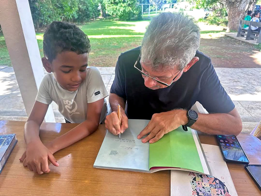 Depuis la crèche, à l’école Early Years de Port-Louis, les profs nous racontaient des histoires et nous apprenaient à lire les syllabes. À la maison, il y a aussi beaucoup de livres. Mami dit que quand maman avait mon âge, elle était comme moi, elle aimait lire et écrire. Papa aussi lit tous les journaux de la semaine et il aime beaucoup les livres, et moi j’aime faire comme lui. J’ai aussi participé à un atelier (Avril Livre 2025) à l’ICJM, organisé par Monsieur Rowin Narraidoo. Il y avait beaucoup d’auteurs là-bas. J’ai rencontré beaucoup de gens qui avaient du talent comme Kylian qui était venu faire un slam et aussi mon auteur préféré Monsieur Michel Ducasse. Il m’a dédicacé son livre. J’aime bien son poème : Enn zour an plis, enn zoli miss.