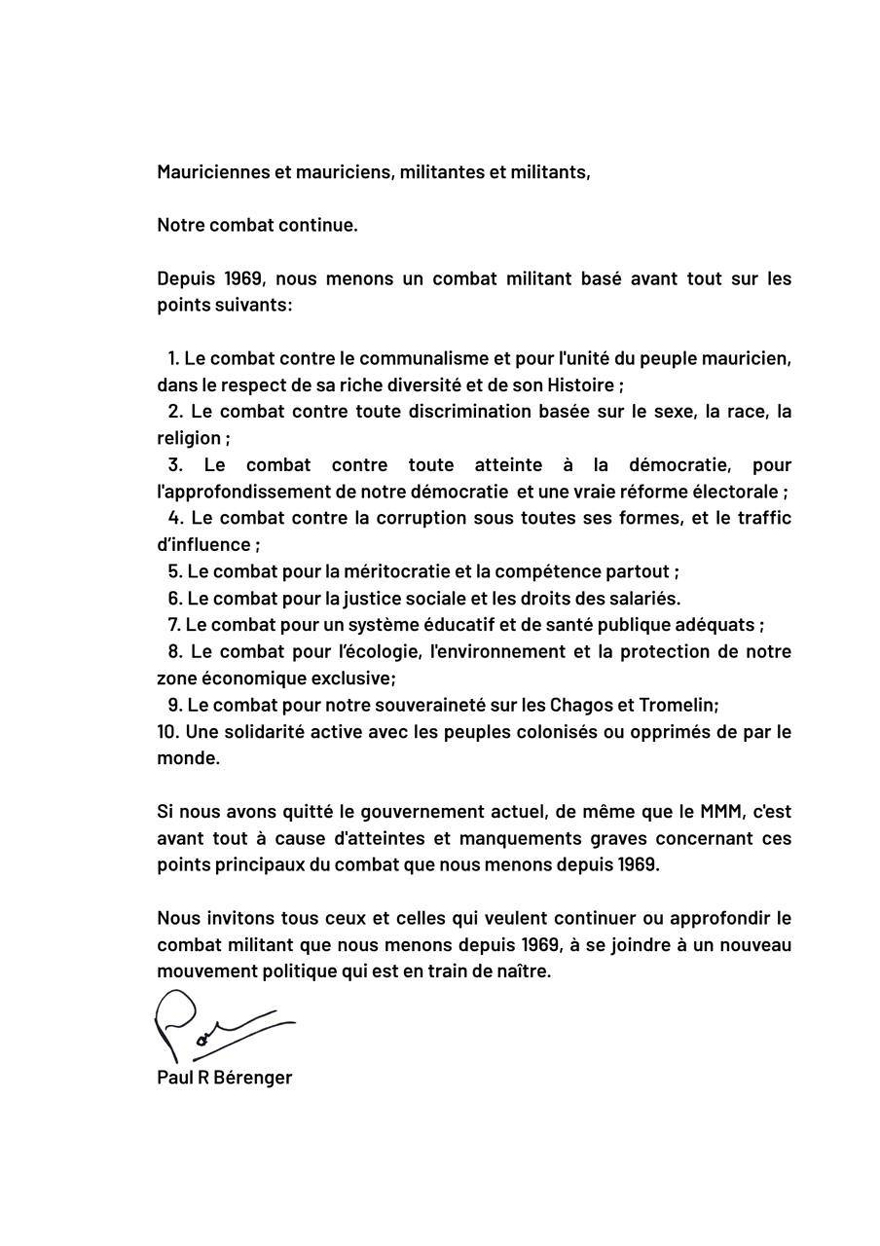 Dans un message adressé au public, de son compte Facebook, Paul Bérenger lance un appel à celles et ceux qui souhaitent s’engager davantage en rejoignant son mouvement politique en gestation. Il a, d’abord, remercié toutes les personnes ayant manifesté un intérêt pour rejoindre cette nouvelle plateforme, soulignant l’importance de cette mobilisation citoyenne dans le contexte actuel. L’ancien Deputy Prime Minister, démissionnaire du MMM, invite ensuite les intéressés à franchir une nouvelle étape en s’inscrivant officiellement via un formulaire en ligne : «Mo remersi zot tou ki finn montre enn lintere pou rezwenn nou mouvman», exprime-t-il, avant d’encourager chacun à suivre le lien mis à disposition afin de permettre à son équipe de prendre contact et de partager les informations relatives aux prochaines activités. La veille, celui qui a rejoint les rangs de l’opposition a adressé un autre message aux «mauriciennes, mauriciens, militantes, militants» : «Notre combat continue».