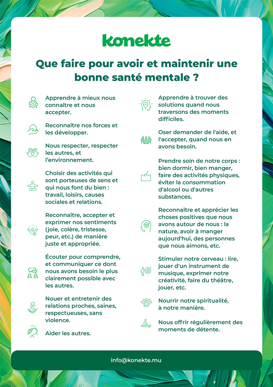 …et l’emmener vers un meilleur-être. Prenez ce temps pour vous. Un cadeau inestimable que vous vous offrez parce que vous êtes tout simplement formidable ! La Journée mondiale de la santé mentale, observée le 10 octobre, c’était le moment de dire «stop» et de comprendre qu’il faut parfois ralentir, s’ouvrir à l’introspection, pour mieux construire, mieux avancer. Un engagement qui dure tout le mois d’octobre et qui peut vous aider à mettre en place de bonnes bases. Mari serye, non ? Comment se lancer ? Comment prendre soin de sa mental health ? Comment se faire du bien ? Enn mari kass tet ! Oui, parfois, ce n’est pas facile de faire le premier pas. C’est pour cela que Konekte, à l’occasion de cette journée symbolique, partage des conseils pour cultiver un équilibre durable entre corps, cœur et esprit ; des gestes accessibles à tous, mais qui peuvent transformer profondément votre rapport à vous-même et aux autres. Cette entreprise sociale s’engage depuis plusieurs années à promouvoir le bien-être émotionnel et social. Sa mission : replacer l’être humain au cœur de ses choix et encourager chacun à vivre de manière plus consciente, plus apaisée, plus alignée.