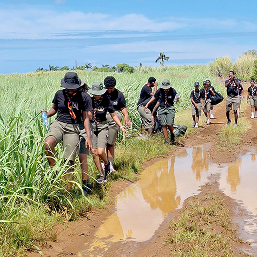 Le coup de sifflet du chef donne le ton. Après l’accueil et des consignes claires, Jahssy rompt les rangs pour entamer une longue marche de Rivière-des-Anguilles à St-Félix, en passant par Andréa, Roche-qui-Pleure, Riambel et Pomponette. À la file indienne, à la manière d’une colonie de fourmis, les scouts avancent sur l’asphalte et à travers les champs de canne avec rigueur et discipline, mêlés de joie, de bonne humeur et d’un fort esprit d’équipe, malgré un soleil de plomb.