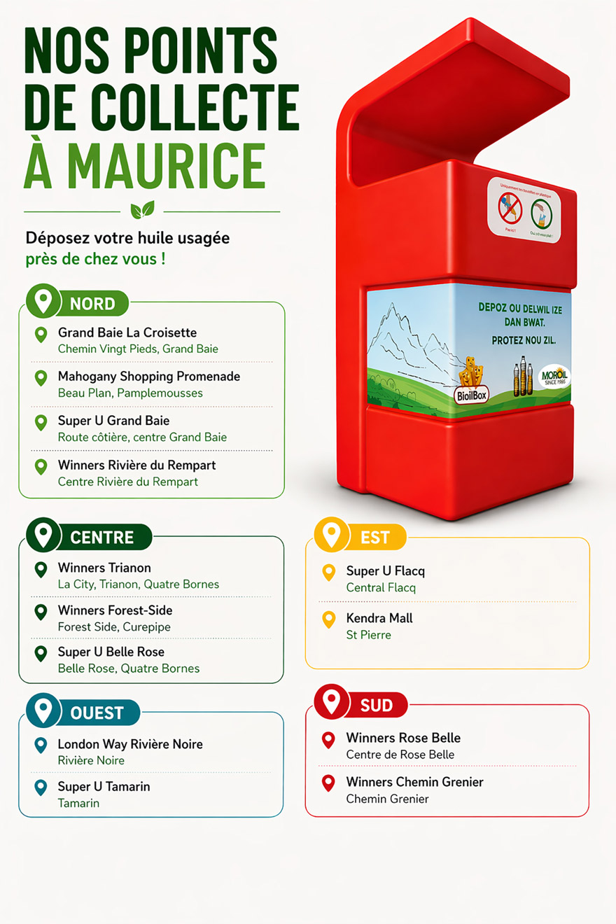 Une sacrée responsabilité. «Pourquoi est-il important de ne pas jeter ces huiles dans l’évier ou avec les déchets ménagers ? Parce que c’est un geste qu’on pense anodin… mais qui a des conséquences bien réelles. Versée dans l’évier, l’huile finit par encrasser les canalisations et perturber les systèmes d’assainissement. Mais surtout, elle finit souvent dans la nature, où elle pollue les sols, les rivières et les lagons. À l’échelle d’une île comme Maurice, l’impact est direct. Une petite quantité d’huile peut déjà contaminer une grande quantité d’eau et perturber les écosystèmes. 1 litre d’huile usagée peut polluer jusqu’à 1 000 litres d’eau ! Et pourtant, beaucoup de gens ne le savent tout simplement pas. C’est aussi pour ça que la BioilBox existe.»