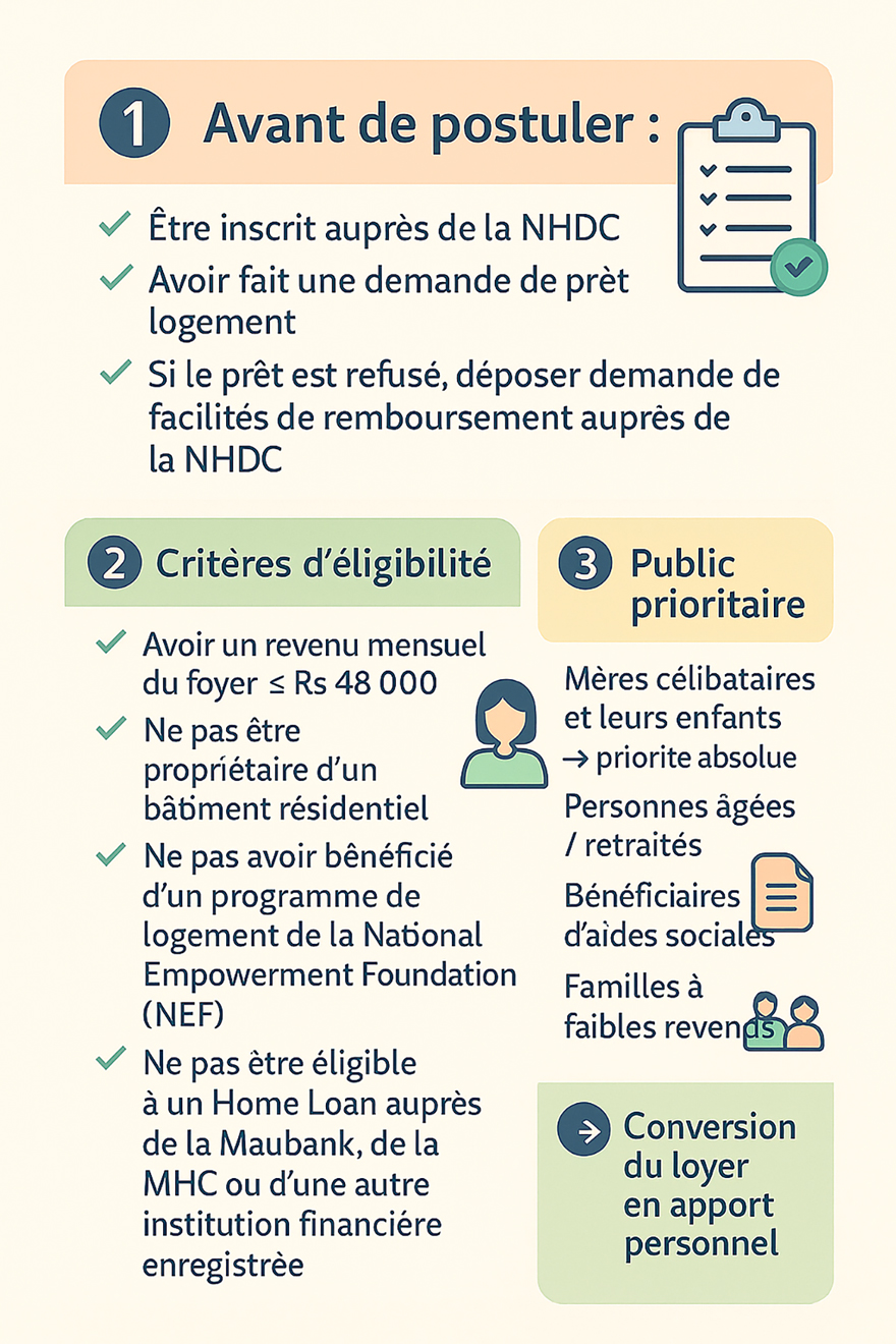 Être inscrit auprès de la National Housing Development Company Ltd (NHDC) selon les critères habituels (https://nhdcmauritius.com/nos-services/devenir-proprietaire-dune-maison).