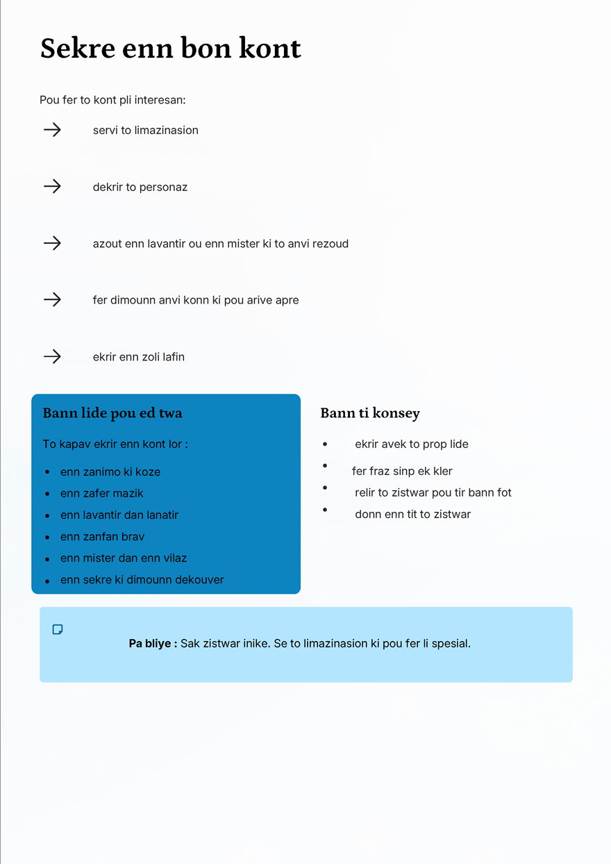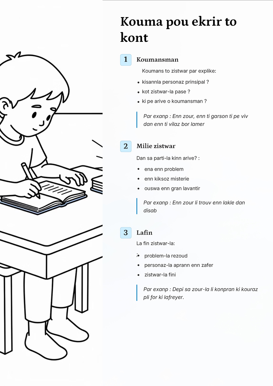 Et si la prochaine belle histoire venait de l’imaginaire d’un enfant ? Une tizistwar qui frétille, cherche ses mots et assemble ses idées, prête à prendre son envol. Les Éditions Leko lancent actuellement un concours national d’écriture de contes intitulé «Konkour nasional - ekrir enn ti zistwar», une initiative qui invite les plus jeunes à donner vie à leurs histoires. Découvrez ci-dessous le «Gid pou ekrir enn kont».