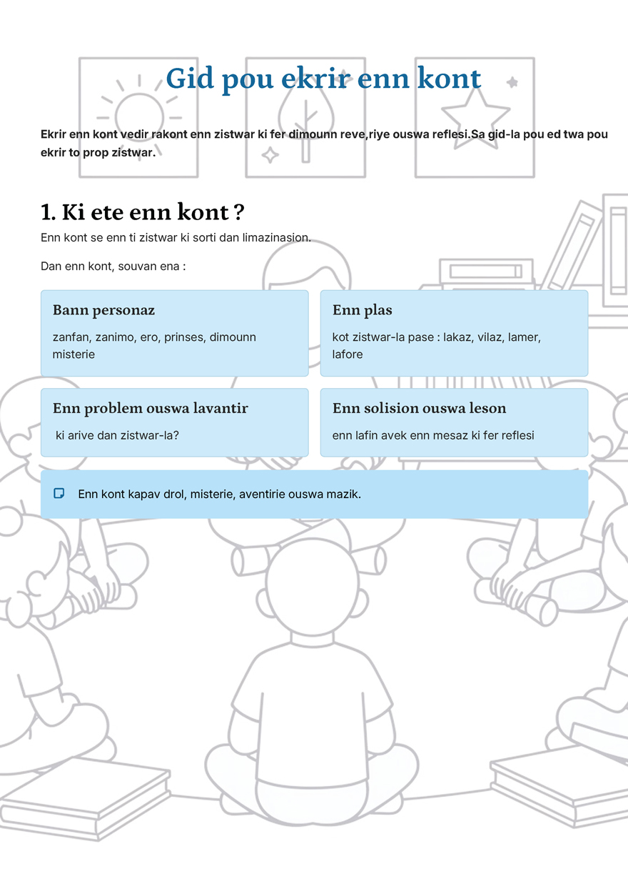 Un concours pour les jeunes auteurs. Ce concours s’adresse aux élèves de Grade 4 à Grade 6, ou aux enfants âgés de moins de 12 ans. Les participant.e.s sont invité.e.s à rédiger une courte histoire de 150 à 200 mots, en kreol morisien. Aucune thématique n’est imposée, laissant ainsi toute la place à l’imagination.
