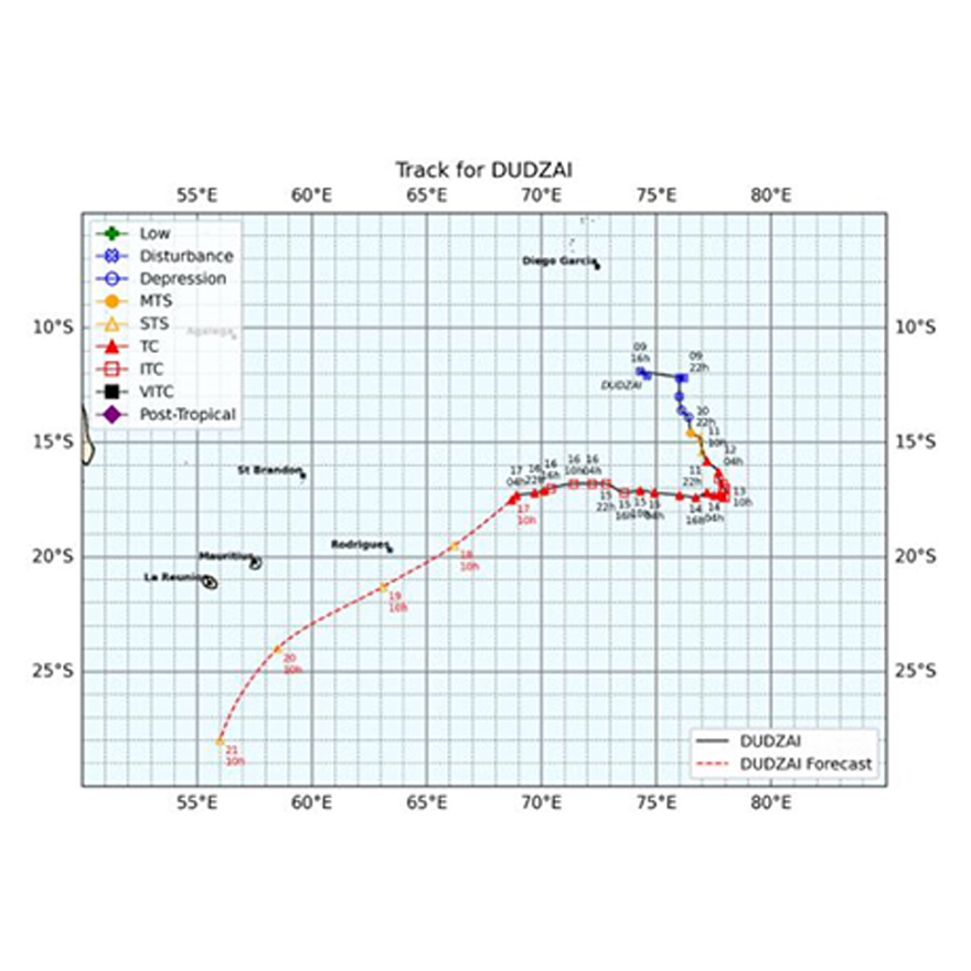Sur cette trajectoire, DUDZAI s’approche de Rodrigues et représente une menace potentielle pour l’île.