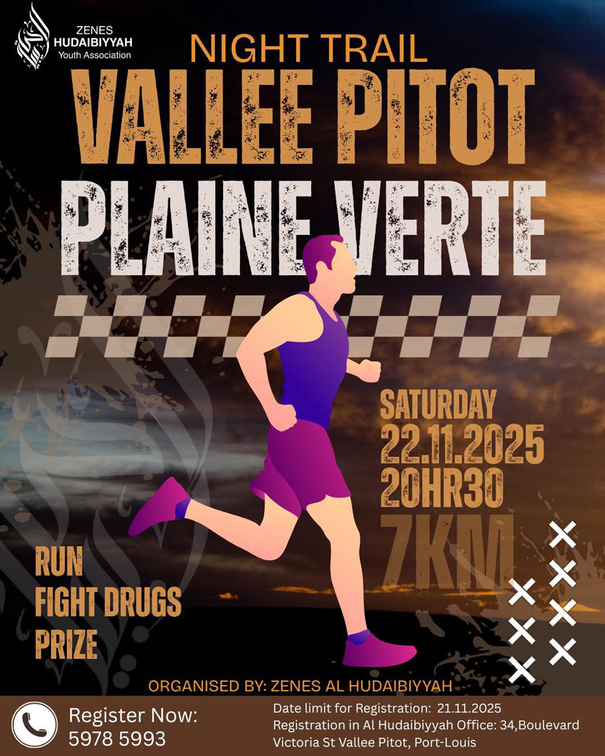 Mobiliser la jeunesse autour de valeurs fortes. Les quartiers populaires de Vallée-Pitot et Plaine-Verte vont vibrer au rythme d'un événement sportif et social unique. Depuis plusieurs jours, une effervescence règne dans les locaux de l'association Zenes Hudaibiyyah Youth Organisation à Vallée-Pitot, où les membres sont à pied d'œuvre pour organiser leur «Night Trail Vallée-Pitot – Plaine-Verte». Difficile de manquer l'arche impressionnante installée pour l'occasion sur le Boulevard Victoria ! Un Trail Nocturne sous le signe de la prévention contre le fléau de la drogue.